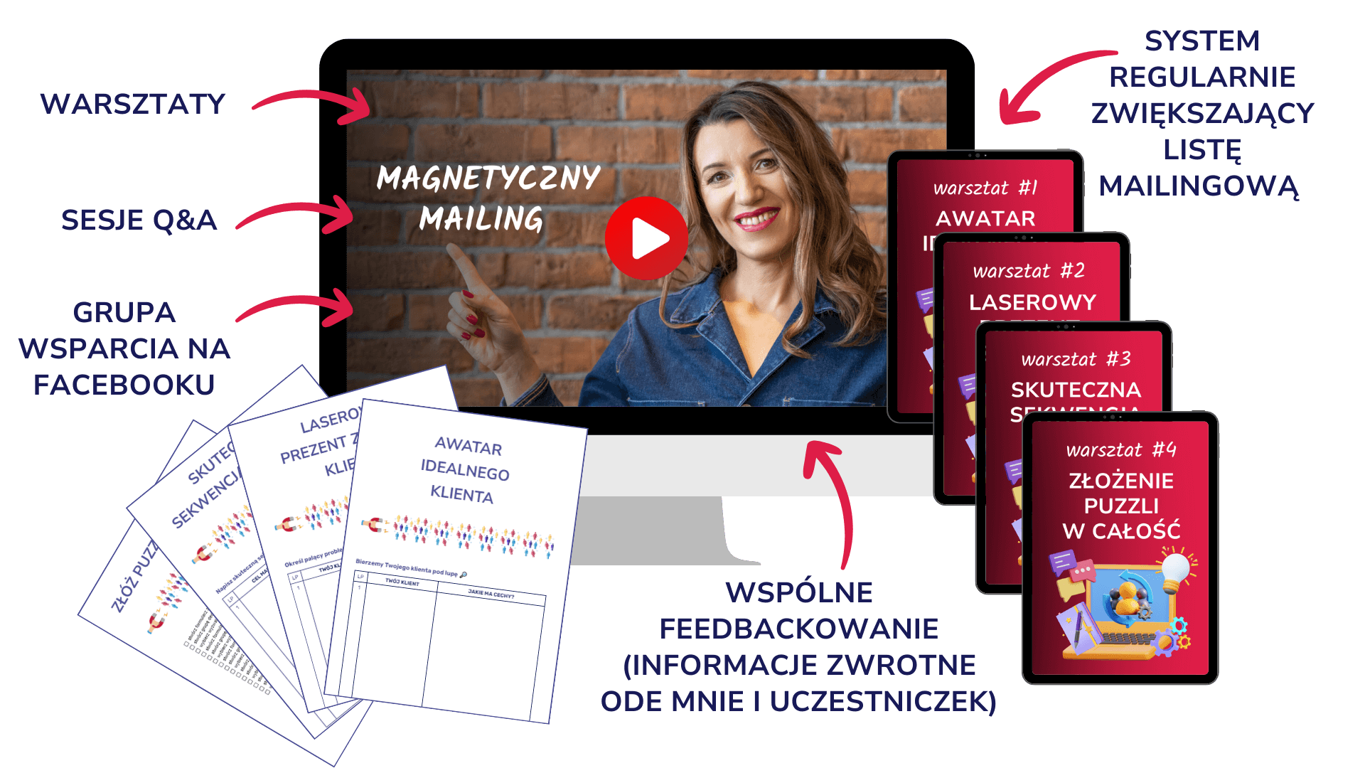 MAGNETYCZNY MAILING to grupowy program budowania wartościowej listy mailingowej dla coachek, edukatorek i ekspertek, które wiedzą, że newsletter jest ważny w sprzedaży i budowaniu biznesu, oraz chcą mailowo rozmawiać z potencjalnymi klientami.