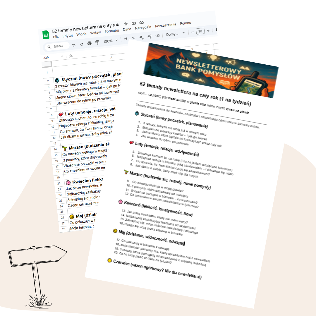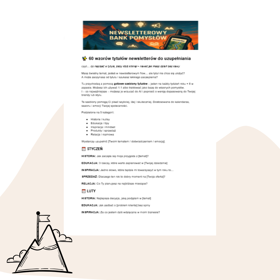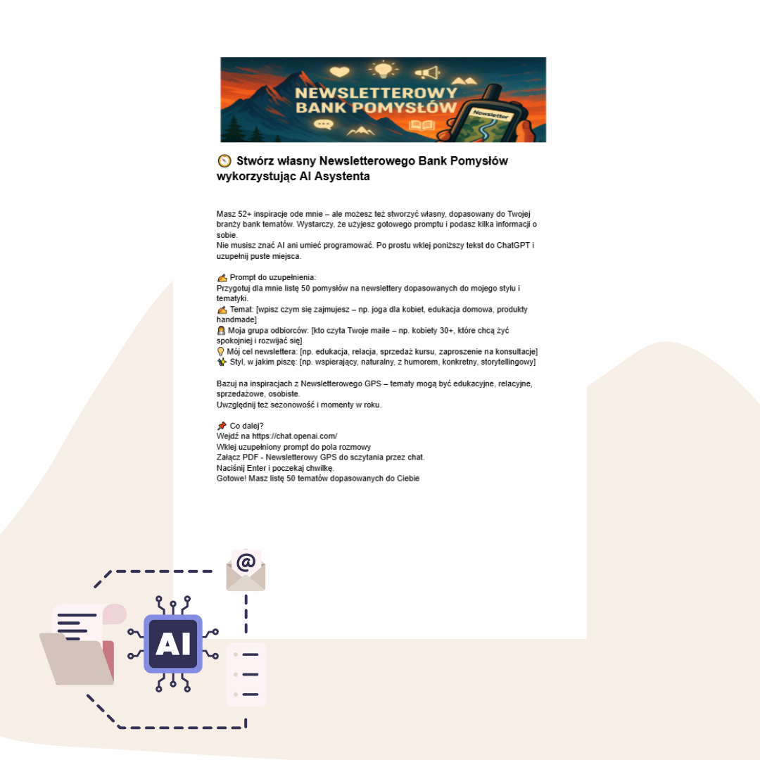 to pakiet z 52 pomysłami na maile, wzorami tytułów, a także z gotową instrukcją do AI, który pomoże Ci tworzyć newslettery w mniej niż 60 minut – nawet gdy brakuje Ci weny, czasu albo pomysłu.